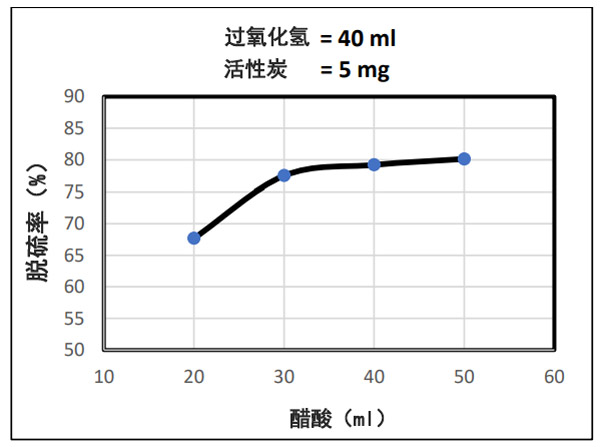 在本研究的最后三個(gè)樣本中,有H2O2和活性炭量是固定的,而乙酸的體積卻有所變化。混合物中乙酸含量的增加會(huì)導(dǎo)致脫硫百分比的增加,因?yàn)榘l(fā)現(xiàn)乙酸具有比其他酸更好的氧化脫硫效果,而且大量的乙酸會(huì)導(dǎo)致過乙酸(CH3COOOH)的增加乙酸和(H2O2)之間的反應(yīng)產(chǎn)生的水量。(CH3COOOH)將與大量的硫化物反應(yīng),并將其氧化為砜或亞砜。該研究的結(jié)果顯示在圖(3)中。