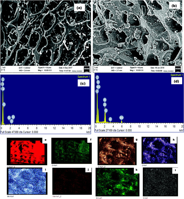 同時,EDX結(jié)果也證實了用KMnO 4和氯氧化鋯的氧化過程顯著增加了載鋯活性炭上的氧部分。元素組成結(jié)果要求Zr金屬元素在碳表面上的含浸量為14%。其他氧化元素的存在,即氧氣和錳也證實了載鋯活性炭內(nèi)在的氧化活性。在改性過程中,與未加工的活性炭相比,氧部分變成了兩倍以上,而活性炭對于應(yīng)用部分則顯示出良好的征兆。因此,F(xiàn)E-SEM和EDX映射的結(jié)果聯(lián)合顯示,這種改性將原始活性炭的結(jié)構(gòu)模式改變?yōu)榫哂懈嗫椎母植诘暮醣砻,這將有助于其應(yīng)用。