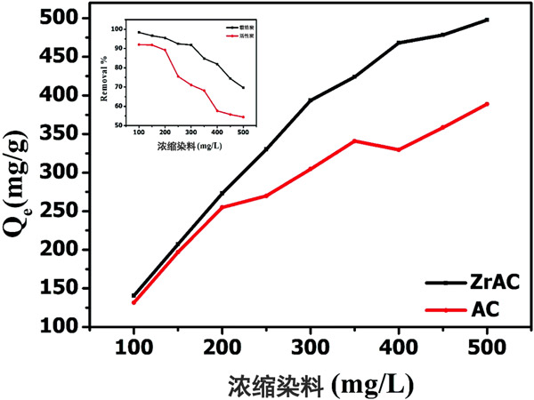 吸附等溫線 已經(jīng)進(jìn)行了初步的批處理實驗,以研究新制備的載鋯活性炭的性能并確定其在廢水處理中的可行性。使用活性炭和載鋯活性炭的染料吸附如圖3所示。該圖顯示,隨著濃度從100 mg L -1增加到500 mg L -1,載鋯活性炭對活性藍(lán)19染料的去除效率更高。同樣,載鋯活性炭的吸附容量也顯示出比活性炭大吸附容量。載鋯活性炭的去除效率和吸附能力的提高主要歸因于較高的氧化功能,該功能很容易從溶液中吸收染料分子。