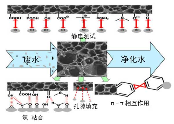 應(yīng)該注意的是,對(duì)活化過程的理解是優(yōu)化活性炭制備的基本步驟。實(shí)際上,各種化學(xué),物理和物理化學(xué)方法被用于從不同的天然或合成資源合成活性炭;瘜W(xué)處理涉及通過浸漬然后熱解使用活化劑,而物理過程涉及在蒸氣或二氧化碳存在下的高溫?zé)崽幚。但是,這兩種方法的組合也已用于生產(chǎn)活性炭。根據(jù)所采用的處理方法,很難預(yù)測(cè)碳的物理化學(xué)和形態(tài)特性?磥硇螒B(tài),物理化學(xué),質(zhì)地,通過改變活化時(shí)間和溫度以及所用前體的性質(zhì),活性炭的表面性質(zhì)會(huì)發(fā)生顯著變化。活性炭表面的化學(xué)性質(zhì)取決于存在于表面上的雜原子的類型,例如氧,氮,硫等。這些積累在表面上的雜原子或基團(tuán)要么來自原材料本身,要么在活化過程中被引入。這在很大程度上與前體的性質(zhì)有關(guān)。所有這些特性對(duì)于使用碳作為水溶液中污染物的吸附劑具有重要意義。實(shí)際上,污染物在活性炭上的吸附是一個(gè)復(fù)雜的過程,在涉及物理作用和/或化學(xué)鍵的過程中,各種相互作用可以共存。從而,可能發(fā)生的吸附機(jī)理為靜電相互作用,氫鍵,π-π堆積相互作用,孔填充,疏水相互作用,離子交換以及其他相互作用(n-π相互作用等)和絡(luò)合反應(yīng)。圖2說明了在活性炭上吸附污染物的主要相互作用方法。