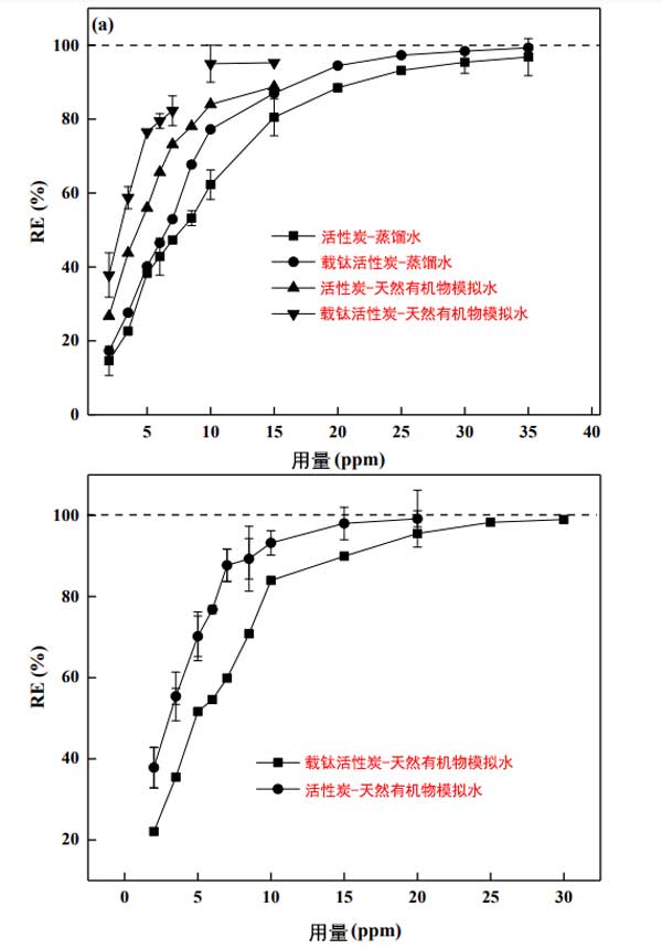 天然有機(jī)物的主要成分是腐植酸和單寧酸,因為它們普遍存在于各種天然水中。圖3顯示了從蒸餾水和天然有機(jī)物水中消除2-甲基異冰片的情況,這取決于光降解前后催化劑的用量。如圖3a所示,發(fā)現(xiàn)兩種催化劑在天然有機(jī)物水中的去除更接近。然而,腐植酸和單寧酸的存在導(dǎo)致活性炭和載鈦活性炭對2-甲基異冰片的吸附能力顯著降低。此外,為了達(dá)到氣味閾值濃度值,兩種催化劑在低天然有機(jī)物濃度的水中所需的劑量比在蒸餾水中增加了大約一倍。這種現(xiàn)象表明天然有機(jī)物和2-甲基異冰片之間對于兩種催化劑的活性位點存在競爭關(guān)系。同時,值得注意的是,當(dāng)微生物分子接近模型污染物時,競爭吸附最強(qiáng)。然而,在光降解后,載鈦活性炭對2-甲基異冰片的去除效率顯著提高(圖3b)。