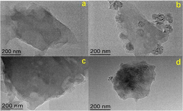 圖1:活性炭樣品的TEM圖像(a)原始活性炭,(b)7%甘氨酸改性活性炭,(c)5%氨改性活性炭,(d)5%氨和7%甘氨酸復(fù)合改性活性炭。