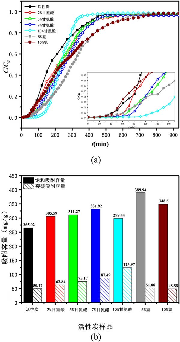 測試了選定的甲苯VOC對活性炭的吸附性能。在每個實驗運行中,甲苯通過裝有活性炭的吸附管直到達(dá)到平衡,即活性炭吸附劑被甲苯飽和。圖2(a)所示的穿透曲線呈現(xiàn)為甲苯吸附量吸附(ç/ç0)與接觸時間(噸,分鐘)六種的活性炭正在進(jìn)行中,它們的飽和和突破吸附容量如圖2所示(b)。從吸附曲線可以看出,甘氨酸修飾的活性炭的穿透時間明顯延長,而飽和氨改性活性炭的時間延長;钚蕴可霞妆酱┩肝侥芰Φ捻樞驗10%甘氨酸改性活性炭>7%>5%>2%>5%氨改性活性炭>未改性活性炭>10%氨改性活性炭,而活性炭對甲苯飽和吸附容量的順序如下:5%氨改性>10%>7%甘氨酸改性>5%>2%>10%>未改性活性炭?梢姼拾彼嵝揎棇妆轿接酗@著的正向影響。與原來的AC相比,甘氨酸改性的活性炭對甲苯的突破吸附能力分別提高了25%、50%、74%和147%,隨著甘氨酸濃度的增加呈上升趨勢。同時,甘氨酸改性的活性炭對甲苯的飽和吸附容量分別增加了15%、17%、25%和13%,且隨著甘氨酸濃度的增加先增加后減少。5%和10%的氨改性也提高了甲苯的吸附性能,但其優(yōu)勢主要體現(xiàn)在飽和吸附容量上,與原來的活性炭相比,分別提高了47%和32%。