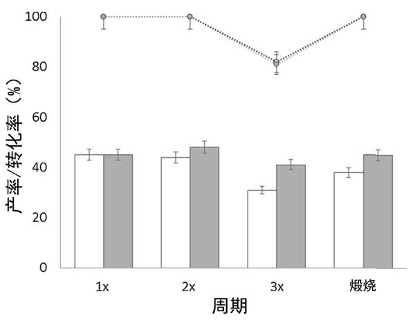 圖2:在160℃的20mL乙醇中從葡萄糖(0.1g)催化劑氧化錫活性炭(白色)和氧化鋅活性炭(灰色)的回收實驗中乳酸乙酯的轉(zhuǎn)化率(點)和產(chǎn)率(條)。
