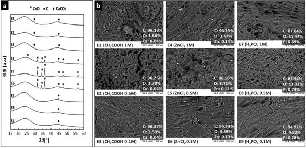 活性炭的X射線衍射圖如圖1-a所示。峰值在2θ=44在所有衍射圖中觀察到的6°歸因于對應(yīng)于石墨(00-001-0646)的(101)平面。與其他材料不同,活性炭的衍射圖也顯示在2θ=26.4°歸因于石墨(00-001-0646)的(002)平面。ZnO和CaCO3可能是在熱處理過程中作為原材料組分和活化劑之間二次化學反應(yīng)的產(chǎn)物或由于前體中固有的殘留礦物質(zhì)含量而產(chǎn)生的。經(jīng)過掃描電鏡分析500倍的SEM顯微照片如圖1-b所示。觀察到所有活性炭都表現(xiàn)出異質(zhì)表面形態(tài),其由不規(guī)則形式的成組薄片組成。在用ZnCl2活化的碳的表面上觀察到與氧化鋅相對應(yīng)的沒有特定形狀的白色小顆粒(通過XRPD分析證實)。此外,EDS分析顯示存在分散在整個表面的碳(C)、氧(O)和鋅(Zn),從而證實了ZnO顆粒分散在這些吸附劑的表面上。