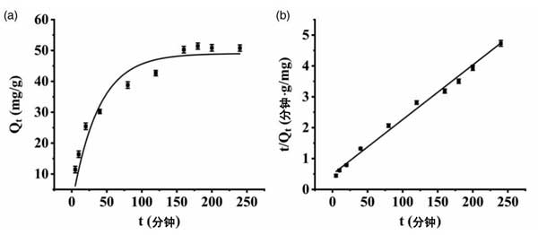 圖3:(a,b)改性活性炭的擬一級動力學(xué)吸附曲線和擬二級動力學(xué)吸附曲線。