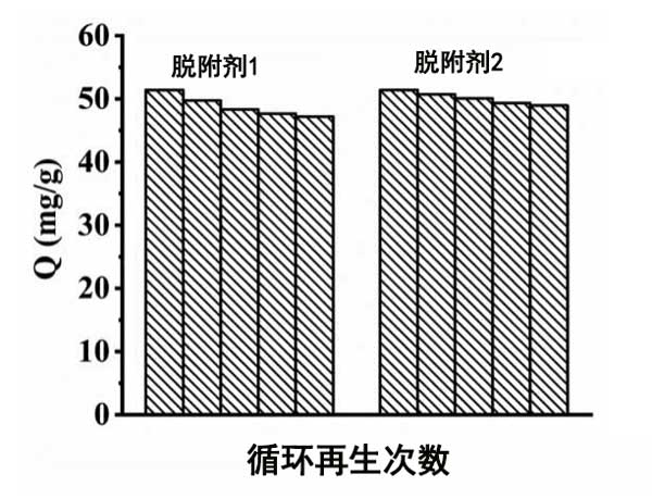 改性活性炭的回收利用在實(shí)際應(yīng)用中具有重要意義,因?yàn)樗梢越档蜕a(chǎn)成本,節(jié)省時(shí)間。為了研究改性活性炭回收的重要指標(biāo),我們考慮了吸附劑活性基團(tuán)的性質(zhì)。在本研究中,對兩種改性后的活性炭進(jìn)行再生。將0.1g改性活性炭吸附的鎘離子分別放入兩種溶液中,在恒溫震蕩器中放置6小時(shí)進(jìn)行解吸再生。然后重復(fù)吸附和解吸實(shí)驗(yàn)5次,樣品溶液再吸附鎘離子的溶解度為0.1g/L。圖4表明0.1mol/L聚乙烯多胺溶液是改性活性炭的合適再生劑,因?yàn)榫垡蚁┒喟肪哂泻軓?qiáng)的絡(luò)合能力,可以在不破壞吸附劑原有結(jié)構(gòu)的情況下解吸金屬離子。這些結(jié)果證明活性炭不僅具有較高的去除率,而且具有良好的回收性能,具有良好的應(yīng)用前景。