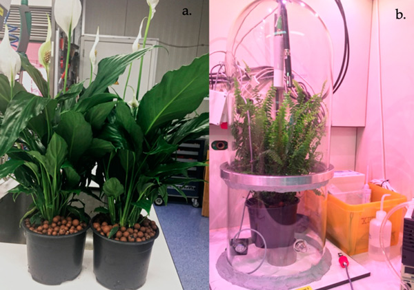 為測試選擇了三種不同的介質(zhì):活性炭和膨脹粘土、土壤。選定的植物盆栽土壤由泥炭、綠色堆肥、石灰和肥料組成;牡倪x擇基于之前的研究,因?yàn)樗鼈兪鞘袌錾铣R姷幕。?duì)于每種類型的基材,進(jìn)行了六項(xiàng)測試:三項(xiàng)使用干基材,三項(xiàng)使用濕基材。將基板分別放入塑料容器中,即基板的暴露區(qū)域。測試了兩種不同的植物(圖1)。每種植物選擇3株進(jìn)行試驗(yàn),并選擇具有相似年齡和大小特征的植物。
