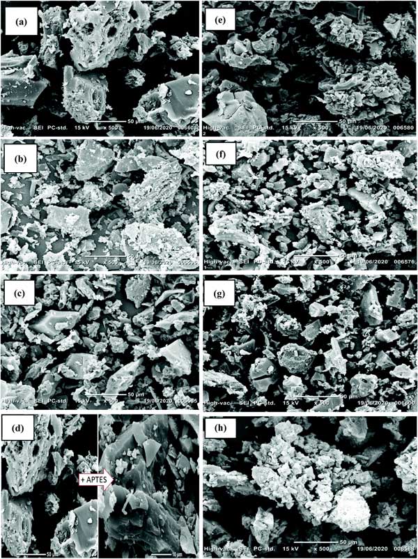 材料的SEM圖像在圖1中給出;钚蕴烤哂胁痪鶆虻墓饣砻,粒徑約為50μm(圖1a)。在用硝酸和過(guò)氧化氫進(jìn)行氧化處理后,氧物質(zhì)(羧基和硝酸鹽基團(tuán))被接枝,導(dǎo)致活性炭-OH的表面比活性炭更粗糙(圖1e)。通過(guò)APTES處理接枝氨基硅烷是成功的:活性炭-APTES和活性炭-OH-APTES表面分別比活性炭和活性炭-OH更光滑(圖1d和f)。裂縫和不均勻的空腔可用作氟化物的吸附位點(diǎn)。存在的粗糙表面和大量白色顆粒證實(shí)了Al顆粒的添加(圖2c、g和h)。這些白色顆?梢詫(duì)應(yīng)于結(jié)合到材料表面的不同形狀和尺寸的Al納米顆粒的不同簇。