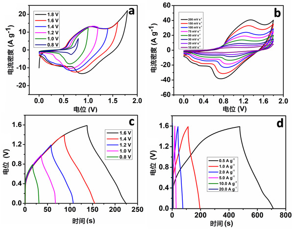 超級電容器裝置的制造是集成陰極(氧化鎳),陽極(活性炭)使用纖維素濾紙(在2.0M/KOH電解液中浸泡放置)分離,然后用絕緣膠帶包裹。陽極和陰極具有相似的幾何表面積,再經(jīng)過合適的重量比來制成電容器。圖2a顯示了超級電容器件在各種截止區(qū)域中的CV曲線,掃描速率為50mVs-1。從圖中可以看出,電容器件的CV曲線呈現(xiàn)出典型的準矩形電容性能,這對應(yīng)于雙電層電容器和贗電容的相互貢獻。此外,當增加工作截止區(qū)時,會發(fā)生更多的法拉第電化學反應(yīng)。當工作電位超過1.7V時,也會在CV曲線上注意到氧氣的釋放;钚蕴/氧化鎳器件很大程度上取決于截止區(qū)域。因此,選擇1.6V作為隨后研究超級電容器件電化學性能的潛在窗口區(qū)域。圖2b顯示了活性炭電容器件在0到1.6V的截止區(qū)域內(nèi)的各種掃描速率下的CV曲線。電流密度隨著掃描速率的增加而增加,并且氧化峰電位轉(zhuǎn)移到更正的電位,類似三電極器件的結(jié)果。
