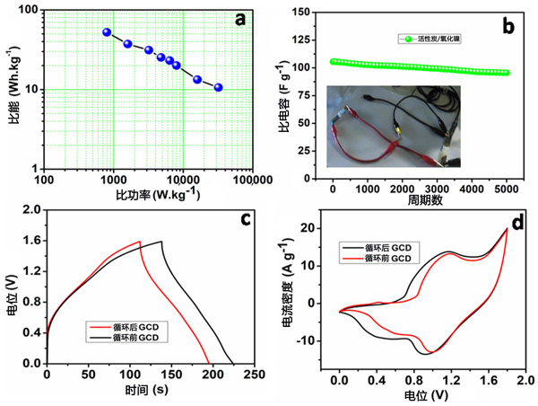 Ragone圖在圖3a顯示。活性炭電容器在功率密度為52.4和10.6Wh/kg-1時顯示出高能量密度分別為800和32,000W/kg-1。接著,研究了活性炭新型儲能器件在1Ag-1下的循環(huán)性能,在0到1.6V的電位窗口范圍內(nèi)進行了超過5000次循環(huán),如圖3b所示。電容器的比電容在1Ag-1的5000個恒電流充放電循環(huán)期間仍保持95.6Fg-1,約為初始電容的90.6%。該器件的恒電流充放電曲線在5000次循環(huán)后仍保持相同的對稱曲線,表明該器件仍具有良好的可逆電化學活性。由于活性炭電容器件在循環(huán)過程中歐姆電阻的增加,比電容正在衰減。由于在充放電過程中活性材料體積的變化,活性材料和基板之間的界面接觸可能會隨著時間的推移而惡化,從而導(dǎo)致器件的歐姆電阻更高。此外,在循環(huán)過程中,活性炭材料可能會從基板上脫落,從而導(dǎo)致電容被低估。因此,必須優(yōu)化電極構(gòu)建方法以提高器件的可循環(huán)性。圖3b從而導(dǎo)致這種活性炭電容器件在下一代儲能應(yīng)用中的巨大潛力。圖3c、d分別顯示了電容器器件的穩(wěn)定性研究(5000次循環(huán)后)之前和之后的恒電流充放電曲線和CV曲線。由活性炭制成的新型儲能產(chǎn)品的比電容在5000次恒電流充放電循環(huán)后仍保持初始電容的約90%。