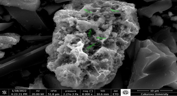 活性炭有著耐用且良好的粘合結(jié)構(gòu),在獲得的SEM圖像中,活性炭具有孔徑在250nm之間的中孔和超過(guò)50nm的大孔結(jié)構(gòu)(圖1)。