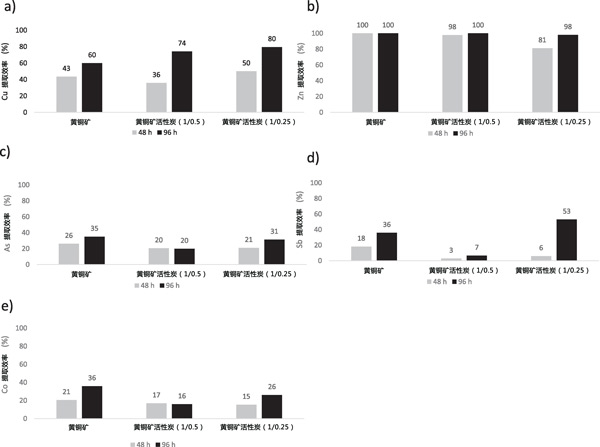 使用帶有攪拌的恒溫浴用于浸出測試,該測試在90℃和250rpm下在250mL硼硅酸鹽玻璃罐中使用H2SO4溶液(在pH值1)濃度為5gL-1的Fe(III)。在浸出過程中控制溫度(90℃)和攪拌速度(250rpm),直到48和96小時。浸出劑溶液的Eh為547mV。硫酸的純度和硫酸鐵(III)分別為97%和99.5%。在每個實驗中,在硼硅酸鹽玻璃罐中稱量2.5g。除對照外,活性炭比為1/0.5和1/0.25。然后,加入50mL浸出劑。使用兩個反應時間對每種活性炭混合物進行兩次浸出實驗:第一次直到48小時,第二次直到96小時。在浸出實驗期間,每24小時打開一次罐子,以確保浸出系統(tǒng)有足夠的氧合。在反應結(jié)束時(48小時和96小時),將紙漿過濾并用50mL/H2SO4洗滌兩次pH2的溶液以回收吸附在活性炭表面上的金屬。通過測定浸出和洗滌溶液中的Cu、Zn、As、Co和Sb的含量。