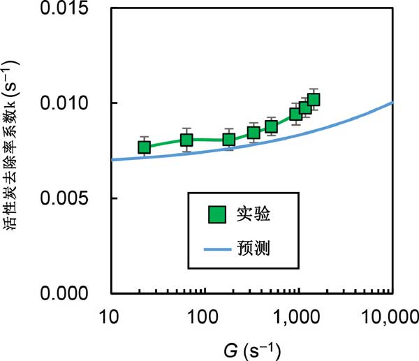 我們研究了混合強(qiáng)度對去除率系數(shù)(k)的影響(圖1)。我們繪制了實(shí)驗(yàn)數(shù)據(jù),實(shí)線顯示了方程式預(yù)測的值。實(shí)驗(yàn)結(jié)果和預(yù)測結(jié)果都表明,去除率系數(shù)隨著混合強(qiáng)度的增加而增加,但在G>1000s-1的范圍內(nèi),實(shí)驗(yàn)結(jié)果的增加率變得更陡峭,偏離預(yù)測的速率系數(shù)值。我們假設(shè)偏差背后的急劇增加是由于活性炭顆粒在高混合強(qiáng)度下的分解(在給炭時(shí)輕度聚集)。這些預(yù)測是在假設(shè)活性炭顆粒的尺寸(部分聚集在原料懸浮液中)在給炭后保持不變的情況下做出的,因?yàn)樵活w粒尺寸測量是不可能的。如果這個假設(shè)是正確的,那么去除率系數(shù)隨著混合強(qiáng)度的急劇增加,在高G對于在給炭時(shí)已經(jīng)處于分散狀態(tài)的活性炭顆粒,不應(yīng)觀察到-值范圍。為了驗(yàn)證這一假設(shè),我們使用了非聚集活性炭,其粒徑在分散處理前后沒有變化,我們在不同的混合強(qiáng)度。我們沒有觀察到隨著活性炭混合強(qiáng)度的增加,去除率系數(shù)的急劇增加,強(qiáng)烈表明觀察到的活性炭的急劇增加是由于高混合條件下的顆粒分解。