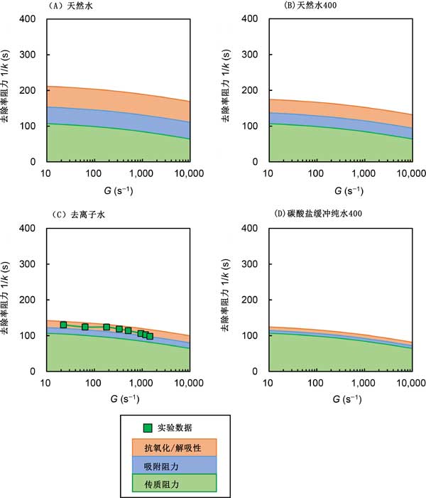 圖2:去除率阻力(1/k)分解成其成分(即,外膜傳質(zhì)、吸附和氧化/解吸的速率阻力)與活性炭混合強(qiáng)度(G)的關(guān)系。