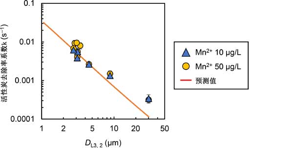 二價(jià)錳離子(Mn2+)在配水系統(tǒng)中被氧化成黑色氧化錳,是飲用水中出現(xiàn)美觀問題的主要原因。為了去除可溶性二價(jià)錳我們研究了游離氯催化氧化去除活性炭表面上的二價(jià)錳,并發(fā)現(xiàn)當(dāng)使用微米級活性炭時(shí)效果比較好。在此,我們新推導(dǎo)出了催化反應(yīng)去除痕量物質(zhì)的動力學(xué)模型,并將其應(yīng)用于二價(jià)錳去除。