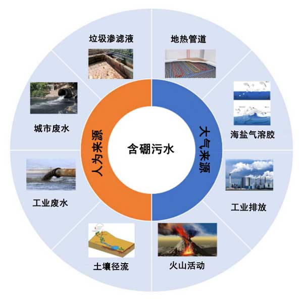 硼通過礦物提取、煤炭燃燒、含硼砂產(chǎn)生的清潔劑的廢水排放、硼肥等應用以及硼化物處理的木材的副燃燒進入水環(huán)境(圖1)。由于人類活動的影響,已經(jīng)觀察到地下水和地表水中的硼濃度增加。硼在水生環(huán)境中的存在會對環(huán)境造成很大的影響。但從工業(yè)設施對硼的需求增加,水資源中硼的含量增加,水質(zhì)標準變得更加嚴格。所以需要去除水中的硼來修復環(huán)境。脫硼方法包括膜分離、活性炭吸附、(電)凝聚和沉淀、萃取以及這些方法的組合。