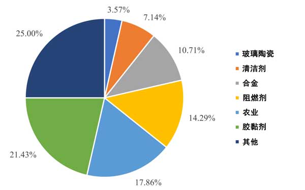 硼是自然界七大必需微量元素之一,少量的硼攝入有利于植物細胞膜保持其結構和功能的完整性,并維持正常的發(fā)育和物質(zhì)運輸。硼不僅是生物體必需的微量元素,也是許多工業(yè)的重要原料,如制造業(yè)和農(nóng)業(yè)。根據(jù)近期的統(tǒng)計數(shù)據(jù),僅硼酸鹽就有300多種應用,全球四分之三以上的硼消耗量來自陶瓷、洗滌劑、化肥和玻璃(圖2)。在生產(chǎn)過程中,硼酸鹽是制造各種特殊玻璃和陶瓷的主要成分。在高級玻璃和玻璃纖維的生產(chǎn)中使用硼硅酸鹽可以提高玻璃的耐熱性和透明度,有利于提高其化學穩(wěn)定性以及抗機械和熱沖擊的能力。在瓷釉中加入硼可以防止脫釉和開裂,提高產(chǎn)品的光澤度和耐久性。在瓷體中加入硼酸鹽有利于降低能耗,提高產(chǎn)品的機械強度。硼還用于生產(chǎn)微合金鍛鋼并提高鋼的沖擊強度。在農(nóng)業(yè)領域,硼被用于生產(chǎn)含硼化肥等產(chǎn)品。但是灌溉水中的硼含量升高會直接導致動植物中毒造成危害,所以一定要控制排放。
