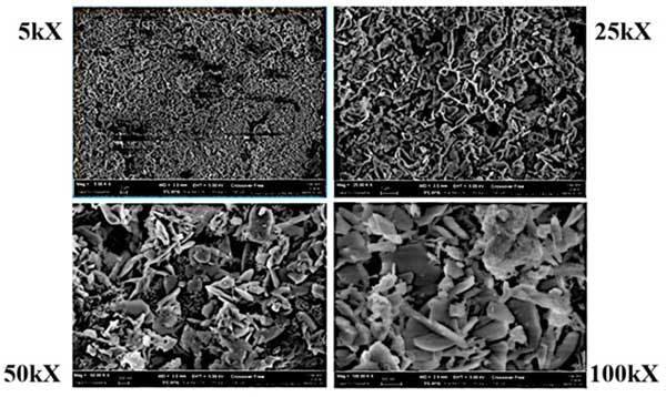 采用掃描電子顯微鏡(SEM)結(jié)合EDS分析來表征吸附劑樣品。局部化學(xué)分析通過EDS(能量色散X射線光譜法)實(shí)現(xiàn)。定性分析是通過識(shí)別光譜中報(bào)告的線來實(shí)現(xiàn)的,而定量分析(確定元素組成百分比)是通過測量樣品中存在的每種元素的線強(qiáng)度來進(jìn)行的。圖1顯示了一系列活性炭的SEM圖像,放大倍數(shù)遞增:5000、25,000、50,000、100,000倍。SEM圖像說明了活性炭的多孔結(jié)構(gòu),突出了樣品表面不連續(xù)性的存在。高孔隙率的存在對(duì)于限制鼓風(fēng)機(jī)系統(tǒng)過濾沼氣的能量損失是必要的。正如我們之前的一些研究報(bào)道的那樣,SEM圖像與EDS分析相結(jié)合可用于突出硫在孔隙和金屬基催化位點(diǎn)內(nèi)的吸附和保留。