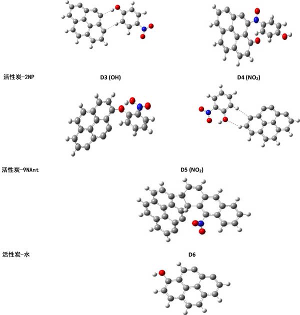 研究的第一步是描述代表固體活性炭吸附劑以及吸附物的分子結構。在之前的理論工作中,已經(jīng)驗證了石墨晶體結構、苯環(huán)簇模型等不同分子結構的適用性。選擇并修改了具有四個苯環(huán)的芘的模型以獲得最終的C16H6結構。第二步,通過2NP、4NP、9NAnt和水的一個分子接近本體,衍生出復雜的結構。第三步是研究水和污染物的共吸附以確定濕度所起的作用。在第四步中,將第二個污染物分子添加到先前計算的復合物中。