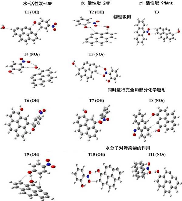 活性炭硝基有機污染物吸附中水的作用,在干燥和潮濕條件下氣相活性炭上4NP、2NP和9NAnt分子的吸附進行了分子水平的系統(tǒng)研究。密度泛函理論計算表明不同物質在活性炭上部不飽和側具有良好的吸附作用。濕度可以刺激吸附。水可以充當主體和吸附物之間的連接劑,但可以產(chǎn)生競爭,因為考慮到其極性行為,它可以直接連接到活性炭的非極性表面。