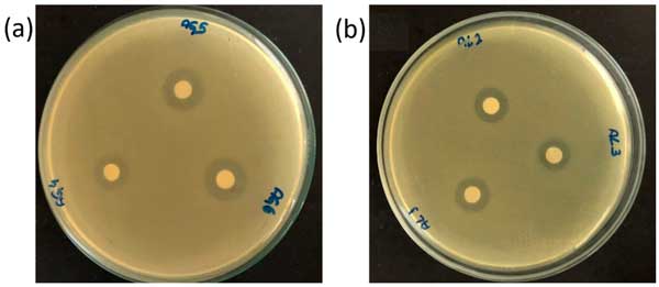 圖2:通過(guò)紙片擴(kuò)散對(duì)(a)水基大蒜提取物,16±1.3mm和(b)乙醇基大蒜提取物,14±1.0mm進(jìn)行抗菌敏感性測(cè)試(從10次重復(fù)獲得的平均值和標(biāo)準(zhǔn)偏差值)。
