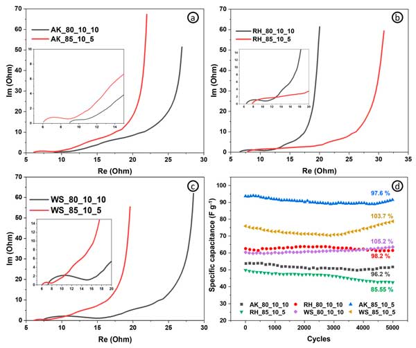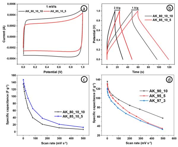 活性炭電極表現(xiàn)出比常規(guī)樣品更好的比電容和能量密度(相同功率密度下的最大能量密度為4.8vs.4.4Wh/kg-1),因?yàn)橛懈嗟幕钚圆牧希娮、倍率能?圖3c)和功率密度—這取決于電極的導(dǎo)電能力(基于導(dǎo)電添加劑含量)。圖3d顯示了具有不同活性炭和碳納米管含量的電極在不同掃描速率下的比電容。碳納米管含量為10%的電極在1mV/s-1下實(shí)現(xiàn)了137F/g-1的最高比電容。從圖中可以清楚地看出,就比電容而言,活性炭和碳納米管的最佳比例為90:10。綜上所述,我們可以得出這樣的結(jié)論:對(duì)于超級(jí)電容器的自支撐電極,活性成分、結(jié)合成分和導(dǎo)電成分的最佳比例為85:10:5?梢赃M(jìn)一步評(píng)估具有這種含有源自其他生物前體的活性材料的組合物的電極的電化學(xué)性能。