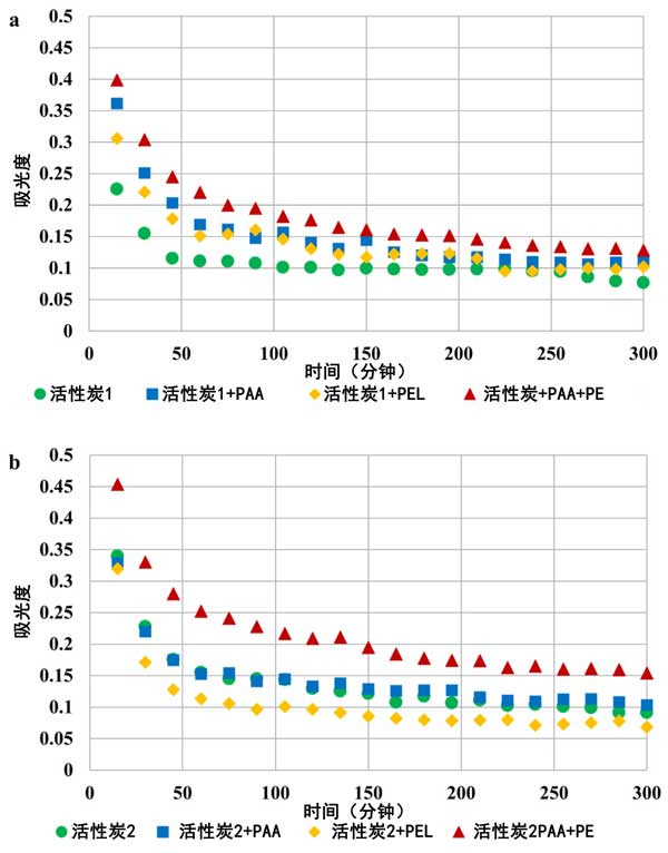 圖4:單吸附質(zhì)和二元吸附質(zhì)系統(tǒng)中活性炭1(a)和活性炭2(b)活性炭懸浮液在pH3時的穩(wěn)定性。