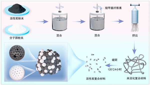 活性炭之所以特別適合用于吸附過程,是因為它具有高度多孔的無定形結(jié)構(gòu),能夠吸附各種分子。它具有微孔和中孔,可以容納各種大小的分子,補充了分子篩的孔隙特異性;钚蕴窟具有利用功能基團改變其表面化學(xué)性質(zhì)的潛力,從而增強其與目標(biāo)分子的相互作用。本文以羧甲基纖維素為黏合劑,通過機械混合和擠出法制備了一系列 華活性炭分子篩復(fù)合材料(圖1)。