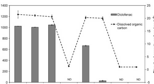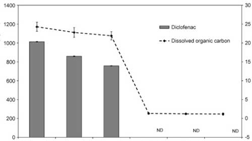 使用活性炭除去雙氯芬酸鈉是定性高效的,通過(guò)零吸收和低濃度的DOC的,并且在通過(guò)所獲得的色譜中沒(méi)有檢測(cè)到雙氯芬酸鈉。得在所研究的處理階段中,在活性炭上的吸附導(dǎo)致最顯著的雙氯芬酸鈉去除。因此,雙氯芬酸鈉沒(méi)有水樣中的這個(gè)階段(LOD之后檢測(cè) = 2 μg L−1)?紤]到所述方法的定量限為3 μg L−1,通過(guò)活性炭除去雙氯芬酸鈉的至少99.7%。因?yàn)闆](méi)有研究活性炭的破裂曲線(xiàn),所以活性炭的結(jié)果可以被認(rèn)為是定性的。然而,為了研究在大型水處理廠中去除雙氯芬酸鈉,必須改進(jìn)該方法以達(dá)到較低的檢測(cè)限(約μg L−1)。