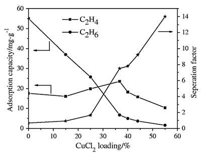隨著氯化銅含量的增加,活性炭吸附劑上乙烯和乙烷分離的分離因子增加。同時(shí),在氯化銅含量為36.7%時(shí)出現(xiàn)乙烯的最大吸附量。很明顯,π-絡(luò)合作用占主導(dǎo)地位。