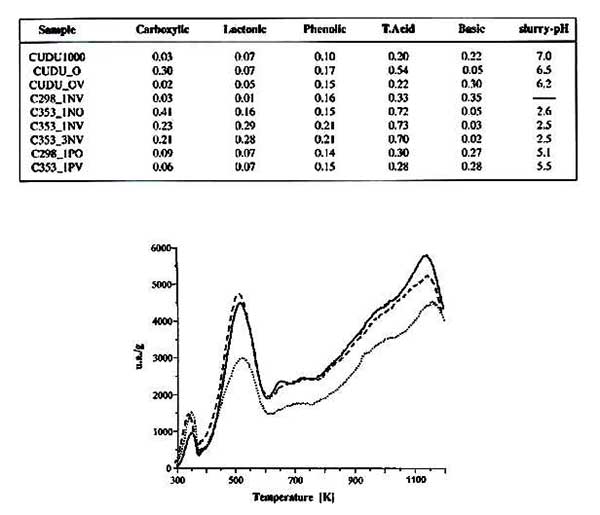 圖1顯示了過氧化氫處理后產(chǎn)生的活性炭的化學(xué)行為。從上面看出的氧化過程增加了活性炭的總酸度,并且與羧基和酚類基團(tuán)的增加一致。此外,TPD曲線顯示了放出氣體的增量,峰值集中在與活性炭相同的溫度。低溫和高溫分解組的面積總體增加歸因于羧基-內(nèi)酯類結(jié)構(gòu)和后面的酚類基團(tuán)。H2O2氧化碳的FT-IR光譜在1542和1190cm-1處顯示帶就像那些原始的碳,但后來的孔隙已經(jīng)擴(kuò)大,顯示出C-O伸展模式的增加?傊,這些研究表明僅在H的性質(zhì)的小變化H2O2處理過的碳,即,是在氧化時(shí),其類似于由其他研究人員報(bào)告的行為沒有觀察到變化顯著。其中過氧化氫溶液的氧化作用明顯地看作羧酸類基團(tuán)的重要減少,伴隨著堿性基團(tuán)的大量增加。