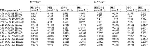 為了進(jìn)一步闡明聚乙烯亞胺浸漬量對活性炭上金屬離子平衡吸附容量的影響,本文計(jì)算和比較了PEI浸漬AC上重金屬離子吸附的相互作用參數(shù)(表示為PEI)。應(yīng)該指出的是,I PEI不等于絡(luò)合常數(shù),只計(jì)算比較重金屬和PEI浸漬的活性炭表面之間的相互作用程度。