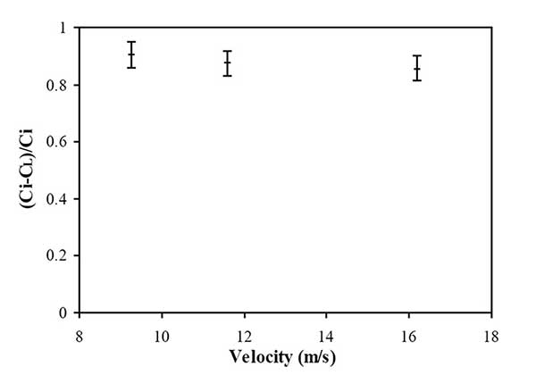 旋風分離器系統(tǒng)對應(yīng)于具有強大的慣性力場的移動床粒子。雖然活性炭尺寸和流速兩個參數(shù)在吸附過程中都起著關(guān)鍵作用,但顆粒尺寸有更明顯的趨勢;趧×业耐牧鳎吡魉傩纬筛玫幕旌蠗l件,但使吸附劑顆粒的停留時間極短,這可能降低與旋風分離器內(nèi)的目標氣體流動的接觸概率。例如,350升/分鐘(1pm)的流速導致16.2米/秒的入口速度,從而導致在旋風分離器的混合室內(nèi)停留時間大約為0.14秒。因此,為了有效利用活性炭顆粒直至完全吸附,顆粒應(yīng)盡可能多次重復使用。
