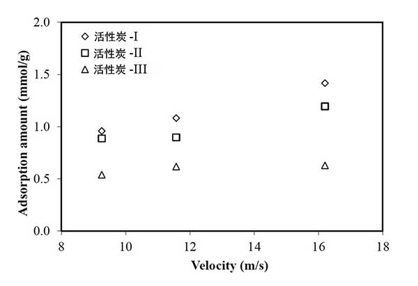 間歇填充床試驗中,活性炭對于甲苯蒸氣的吸附容量,即最大容許吸附量,從各種尺寸的活性炭的等溫實驗中發(fā)現(xiàn)為0.01-0.03mol / g。第一次施加到以16.2米/秒運行的旋風分離器的新鮮吸附劑的吸附量對于活性炭-I是1.4mmol / g,對于活性炭-II是1.2mol / g和對于活性炭-III,如圖2所示。它僅僅小于活性炭吸附劑潛在容量的1/10。該旋風分離器中甲苯的吸附量與交流流化床反應(yīng)器的體積(3.3〜5.4mmol / g 活性炭)相當競爭。至于尺寸效應(yīng),小顆粒提供大單位體積的表面積,這可以呈現(xiàn)更多潛在的吸附位點。對于活性炭-I、II、III,各尺寸范圍的面積分別為1145,1034和912m2/ g。
