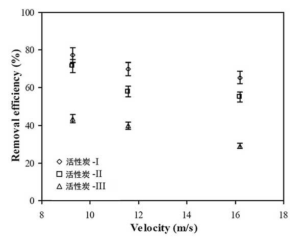流速同時影響氣體吸附和活性炭回收,因為它涉及氣體和活性炭顆粒的混合程度、。圖3在各種活性炭吸附劑尺寸下,氣體去除效率和流量之間呈現(xiàn)出輕微的反比關(guān)系。最小的吸附劑(活性炭-1)以9.26米/秒除去77.4%的甲苯蒸氣,然后以16.2米/秒降至65.4%。微;钚蕴课絼┎东@沿著旋風分離器的流動路徑行進的甲苯蒸氣。雖然在前面的的內(nèi)容說過吸附量以高速增加,但是氣體去除效率相當?shù)。這是因為在高流量下甲苯的絕對體積要高得多。因此,即使活性炭吸附得更多,更多的氣體分子傾向于流出而沒有在內(nèi)部吸收。因此,關(guān)于顆;厥蘸蜌怏w去除效率的最佳流量必須通過在各種操作條件下的眾多實驗來確定。