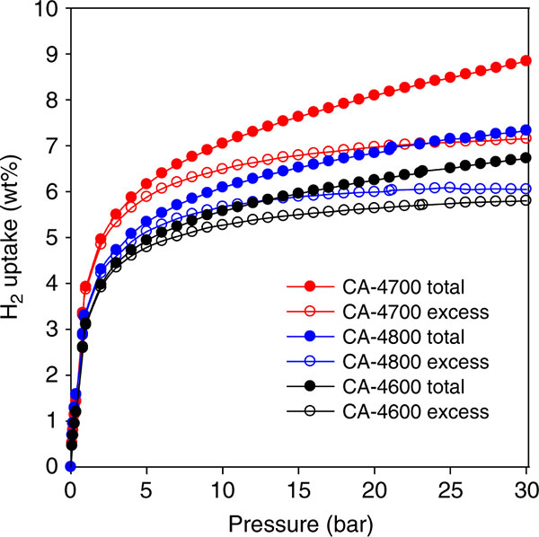 活性炭中的氫儲存需要具有最高表面積和適當(dāng)尺寸的孔的材料。在-196和25℃下使用重量法在HidenXEMIS分析儀上在0-30巴的壓力范圍內(nèi)研究活性炭的儲氫能力。圖2顯示了活性炭在-196℃下的過量和總氫吸收等溫線。對于所有CA-4T活性炭,氫吸收是可逆的,沒有滯后現(xiàn)象,并且在0-30巴的壓力范圍內(nèi)沒有達(dá)到飽和。我們首先注意到1巴的氫吸收非常令人印象深刻,在3.1-3.9wt%的范圍內(nèi)。這種儲氫比為高表面積活性炭傾向于在2-3重量%范圍內(nèi)的任何報告的值高得多。我們將這種特別高的吸收特性歸因于非常高的微孔表面積和富氧表面的組合,特別是對于3.9重量%的活性炭樣品CA-4700。富氧表面的效果是對于活性炭樣品CA-4600,其盡管具有適度總表面積和微孔表面,仍然表現(xiàn)出的吸收比以前發(fā)現(xiàn)的活性炭材料具有高得多的表面積。經(jīng)過研究發(fā)現(xiàn),具有氧官能團(tuán)的活性炭效果預(yù)期在低壓下具有最大效果,其中氫和表面之間的相互作用比在較高壓力下更重要,其中通過空間填充機(jī)制更可能發(fā)生氫吸收。