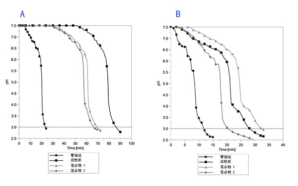 圖1a顯示了在上述的試驗(yàn)結(jié)果。可以看出,在22分鐘后,氣體洗滌瓶中的pH值降至3以下,而在反應(yīng)器中不使用活性炭吸附劑樣品。用活化的氧化鋁樣品裝載反應(yīng)器分別產(chǎn)生66和71分鐘的穿透時間。用浸漬的活性炭實(shí)現(xiàn)了最佳性能,即氯化氫吸附容量為0.0288g/g。將氣體流速提高所取得的結(jié)果如圖1b所示。要進(jìn)行的第一次試驗(yàn)是在反應(yīng)器中沒有活性炭吸附劑負(fù)載,并且在12分鐘后氣體洗滌瓶中去離子水的pH值降至3以下。對于浸漬的活性炭,氯化氫吸附容量從0.0288g/g降低至0.0172g/g。