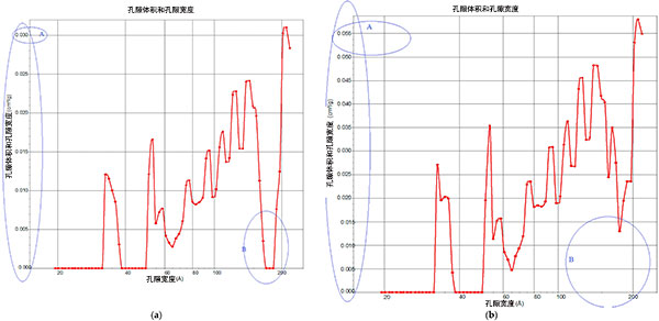 圖2.:(a)未經(jīng)預(yù)處理的活性炭(b)微波處理的活性炭增加孔體積與孔寬度的關(guān)系。