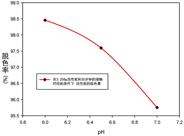 實(shí)驗(yàn)過程中發(fā)現(xiàn),活性炭在較低的pH環(huán)境對顏色吸附效果得到大幅度增強(qiáng)。盡管如此,排放處理的酸性廢水的影響可能直接阻礙水生棲息地。鑒于此,使用預(yù)處理的活性炭吸附研究在6至7的可接受的pH范圍內(nèi)進(jìn)行。考慮的另外兩個因素是劑量和接觸時間,并且它們分別保持在3.208g和35min。從圖3中可以看出可以觀察到,顏色去除的百分比隨著pH的降低而增加。在pH6時獲得最高的顏色去除率98.46%,但隨著pH增加到7,顏色去除率降低到95.69%。