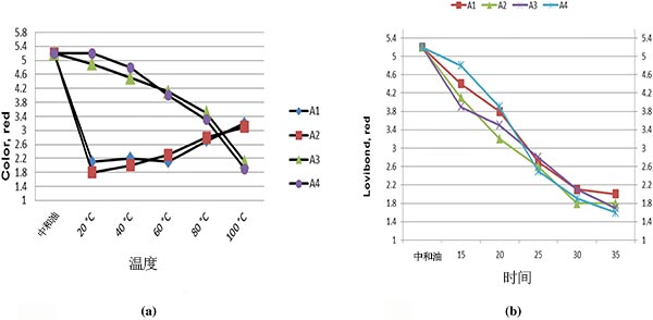 圖2:(a)溫度和時(shí)間(b)對漂白過程的影響。