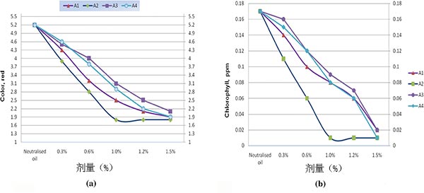 吸附劑的量是漂白過程中最重要的因素。圖3中所示的吸附劑用量的幾種活性炭和漂白土的效果。結(jié)果清楚地表明,活性炭樣品A2在1%吸附劑用量下達(dá)到最佳值,吸附劑用量的進(jìn)一步增加對其沒有顯著影響。這可以通過吸附平衡在吸附劑/油混合物之間達(dá)到最大值的事實(shí)來解釋。然而,通過在漂白過程中增加其它吸附劑A1,A3和A4的數(shù)量來增加顏色吸收,并且1.5%地球樣品A4顯示與1%活性炭樣品A2相同的結(jié)果。圖3b顯示當(dāng)使用漂白土和活性炭漂白葵花籽油時(shí)劑量對葉綠素減少的影響。該圖還表明吸附劑A2對顏色去除的影響比其它的更為有效。