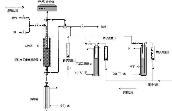 在稱重后將活性炭重新安裝到反應(yīng)器中。然后將閥門切換到解吸過程。將冷卻器的溫度設(shè)定為5℃,并加熱加熱帶直至達(dá)到解吸介質(zhì)的所需溫度(100℃或130℃)。解吸時間為10分鐘。當(dāng)反應(yīng)器的中心達(dá)到約35℃時,將解吸介質(zhì)引入反應(yīng)器中。然后收集解吸的溶劑。當(dāng)滿足設(shè)定的解吸時間時,終止加熱和解吸介質(zhì)并且溫度開始下降。此后,將吹掃的壓縮空氣注入(在某些實驗測試中使用氮?dú)?到反應(yīng)器中,直到中心溫度降至室溫。收集解吸的溶劑并稱重用于計算活性炭的工作容量。工作容量定義為吹掃后飽和VOC吸附容量與碳上殘余VOC的差值。然后使用氣相色譜儀分析溶劑的組成。