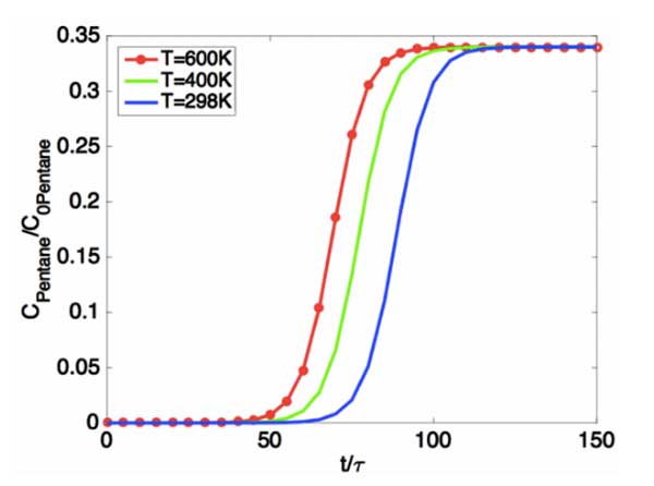結(jié)果與討論我們已經(jīng)提出了一個綜合模型,該模型定量地預(yù)測了填充床反應(yīng)器中油蒸氣回收的吸附動力學(xué)。在該模型中,我們僅考慮軸向擴(kuò)散,并使用質(zhì)量守恒方程來模擬油氣吸附的時空分布。我們假設(shè)活性炭吸附在恒溫下操作,并且與活性炭的吸附容量相比,油蒸氣濃度非常低。此外,假設(shè)油蒸氣中的組分之間不發(fā)生化學(xué)反應(yīng),因此每種組分可以作為獨立的吸附物處理。因此,多組分吸附問題可以轉(zhuǎn)化為單組分吸附問題。下圖(圖2)說明了吸附動力學(xué)的溫度依賴性。