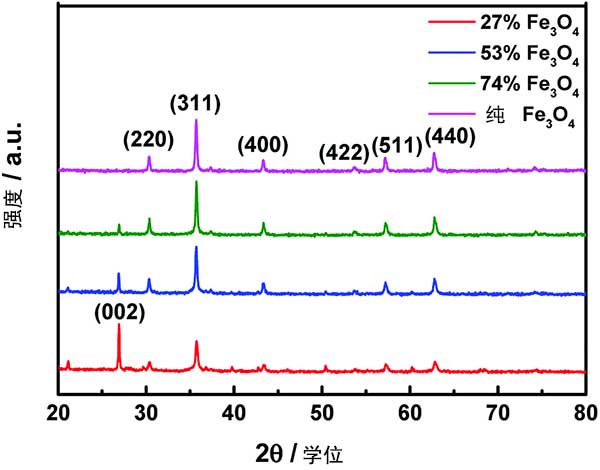 使用XRD衍射儀測量活性炭復合物的晶體結構。圖1顯示了所制備樣品的衍射圖案。在2的特征衍射峰θ= 31.24°,36.82°,44.76°,55.62°,59.30°和65.19°的與(220),(311),(400),(422),(511)和(440)Fe 3 O 4平面一致。此外,在約2峰值θ=26.20°被分配給蓬松結構化活性炭。觀察到Fe 3 O 4衍射峰的強度隨著Fe 3 O 4納米顆粒負載量的增加而增強,并且活性炭的強度在相同的過程中減少。上述現(xiàn)象表明Fe 3 O 4納米顆?梢猿晒Φ匾肱钏山Y構的活性炭上。
