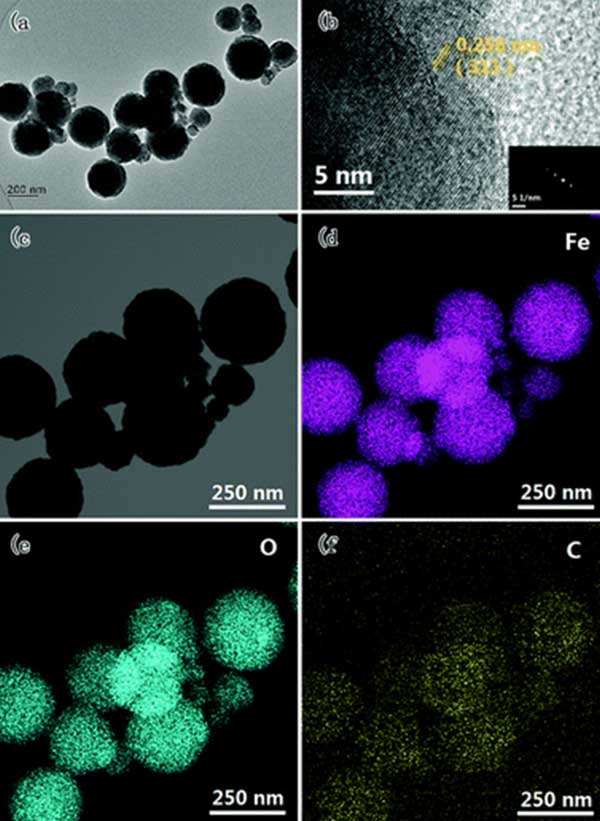 活性炭復合物的TEM圖像和相應的元素分布示于圖5中。如圖,所制備的活性炭均接近球形,粒徑主要集中在約250nm。從圖3(b)中的HR-TEM圖像可以清楚地觀察到單個Fe 3 O 4納米顆粒的良好晶粒取向,并且該區(qū)域中的SAED圖案也顯示出Fe 3 O 4的結晶特征。如圖3(c-f)所示,其中可以清楚地觀察到復合材料由Fe,O和C元素。C的分布區(qū)域明顯大于Fe和O的相應區(qū)域,表明鐵納米顆粒分布在活性炭的表面上。因此,結合XRD,VSM和SEM結果,我們可以得出結論,F(xiàn)e 3 O 4 納米顆粒緊密粘附在活性炭的表面上。