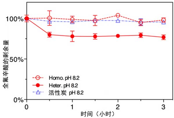 在存在和不存在活性炭的情況下,在密封的40mL燒瓶中在酸性,中性和堿性pH條件下進行全氟辛酸與S 2 O 8的反應(yīng),反應(yīng)溫度為80℃,用恒溫水浴保持。對于大多數(shù)實驗,初始全氟辛酸濃度為0.5μM,活性炭濃度為200 mg/L,500 mg/L或1000 mg/L。對于酸性和堿性條件實驗,使用濃硫酸或150mM氫氧化鈉溶液將pH值調(diào)節(jié)至1.0或13.0。對于在pH 8.2下進行的實驗,使用100mM硼酸鹽作為緩沖液(NaB(OH)4/H 3 BO 4)。在所有實驗中包括五個重復(fù)。