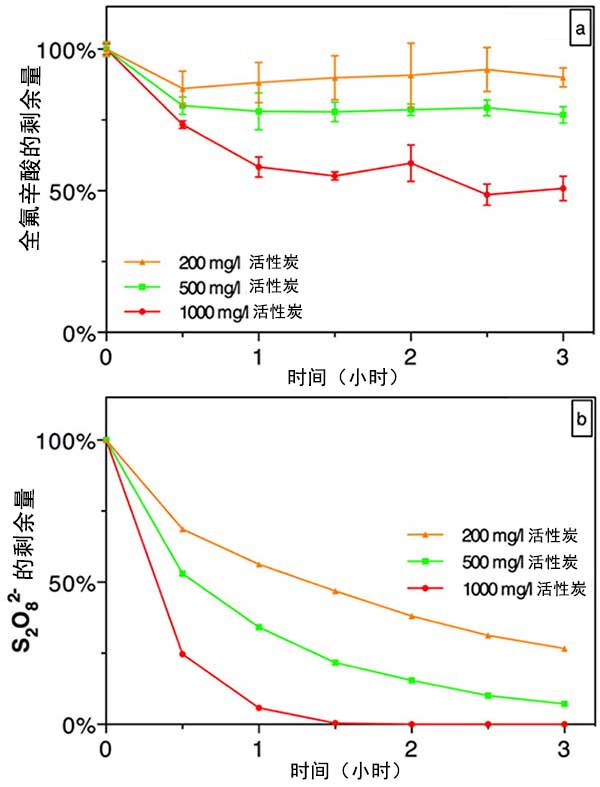 圖2;钚蕴繚舛葘瘜W(xué)吸附去除全氟辛酸(圖2a)和過硫酸鹽分解(圖2b)的影響。