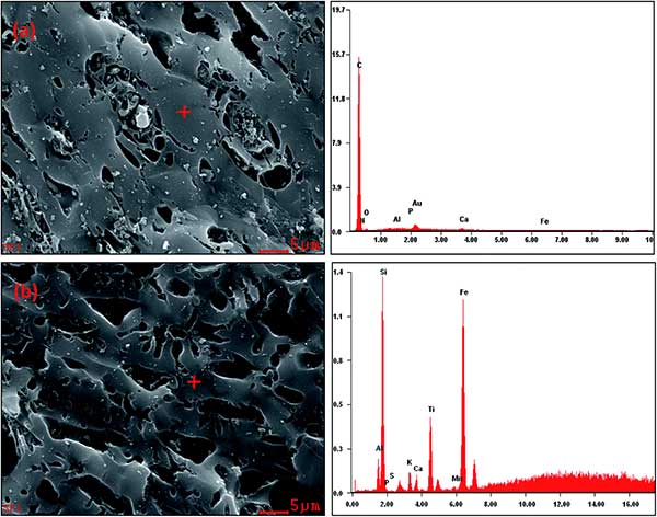 圖1:SEM圖像和活性炭(a)和鐵改性活性炭(b)的相應(yīng)EDS光譜。