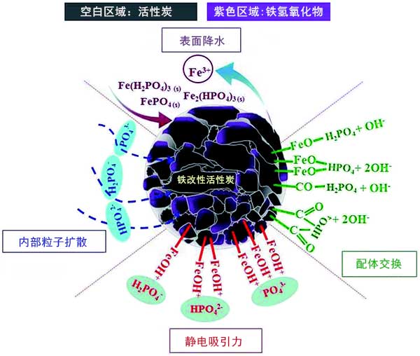 圖4:磷酸鹽吸附到鐵改性活性炭上的可能機制。